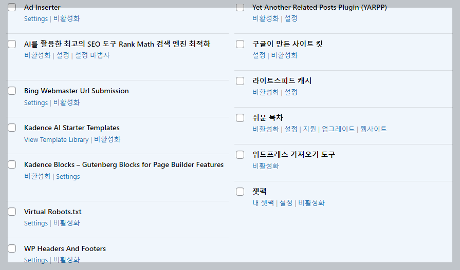 설치를 많이 하면 무거워서 홈페이지 반응속도가 느려질 수가 있으니까 포스팅 정보 참고하셔서 선택하세요