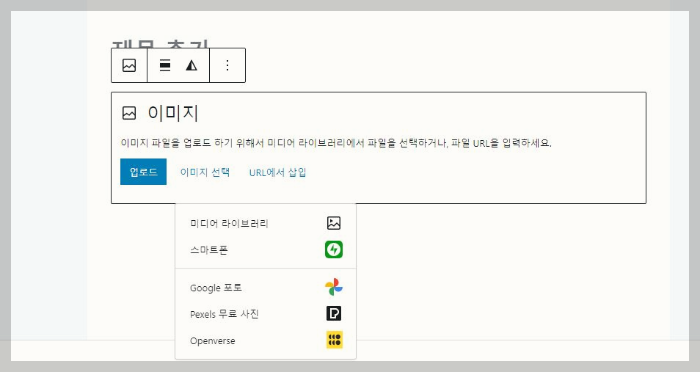 이때, 이미지선택 글자가 안나오고 미디어가 나온다면 젯팩 설정이 잘 되었는지 확인해야 되요